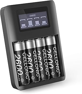 CELLONIC® Chargeur de Piles + 4X Batterie Rechargeable AA 2600mAh LR03, Chargeur AAA AA 9V avec 4 Compartiments et Affichage, Chargeur Rapide Chargeur Piles AA AAA 1.2V Battery Charger LR03 LR6