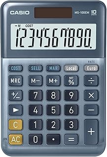 Casio MS100EM Calculatrice de Bureau à 10 Chiffres à énergie solaire/Batterie avec Calcul de Pourcentage avancé, Conversion de devises en euros Bleu